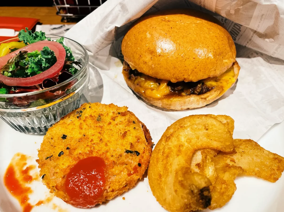 2日目という事もあって、緊張しないでお店に入るものの昨日のカジュアル席とDX席では扱いがまったく異なる。何しろ入店前にオーダーを聞いてくれる。席に着くとすぐに食事とドリンクが運ばれる。これは凄い。まだ夕方ということもあり、軽いものをとハンバーガーを頼んだ。それでも結構なボリュームがあって味もいい。和牛のパティと輪切りにしたトマトのフリッターが気に入った。