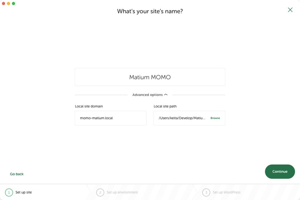 サイト名は「Matium MOMO」、Advanced optionsを開いて、ローカル上のサイトドメインと開発用のディレクトリを指定する。