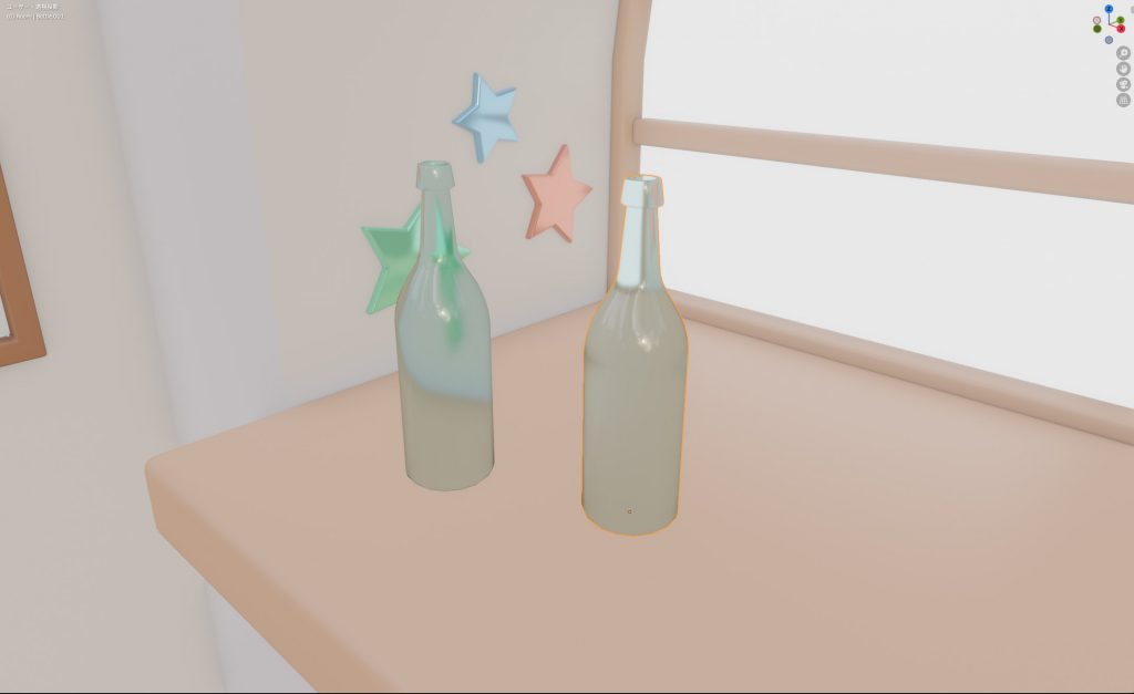 いろいろ触って、最終的にガラスのマテリアルを昨日作成したガラス瓶のモデルに適用して今日の学習は完了。