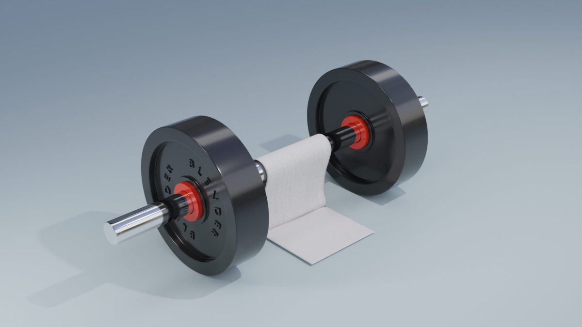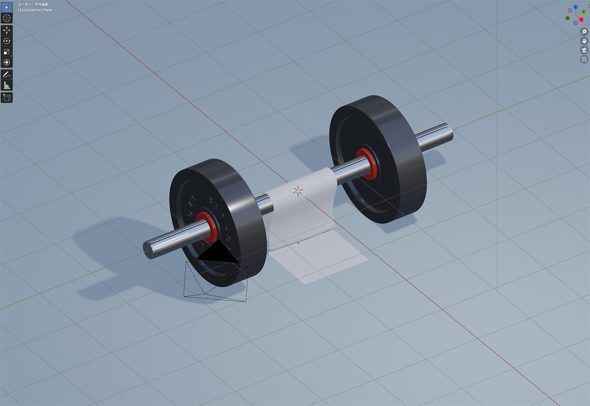 バーベルがモデリング出来たら、今日の学習部分であるクロスのシュミレーション。単純な平面オブジェクトに布の質感を与えて、バーベルに衝突(colision)オブジェクトに設定すると、物理シミュレーションに沿って平面が布のように変形してくれる。