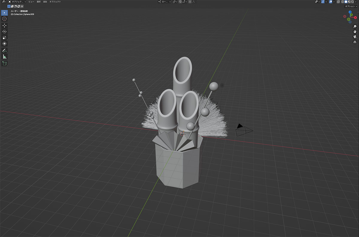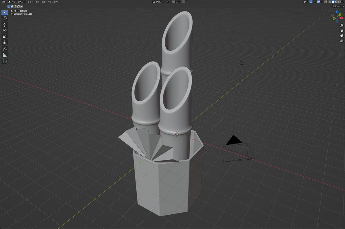 まずは円柱を中心にした簡単なモデリング。竹のモデルを作って並べただけだが、それなりに形になるし、なにより土台の作りがいい。円柱というか、正六角柱だとか正八角柱がベースになっているプロダクトというのは意外と多く、この作り方は為になった。ここまで30分もかかっていないだろう。