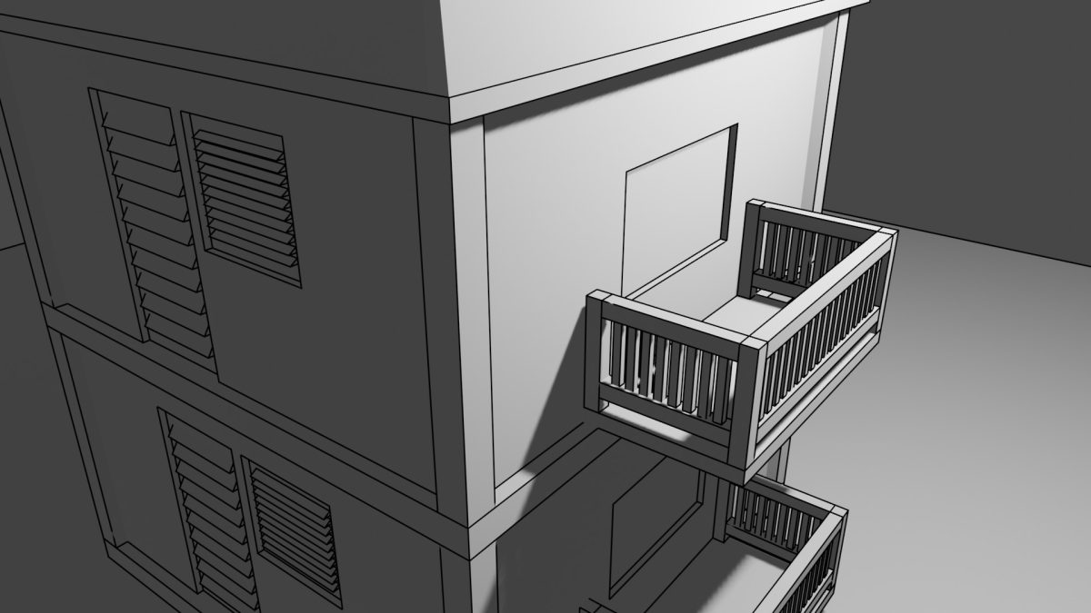 線画レンダリングも試してみる。まずはカメラのFreeStyleを有効にして、それから画面を詰めていくという方法をとるらしい。マテリアルによる陰影をONのままレンダリングするとこんな感じ。